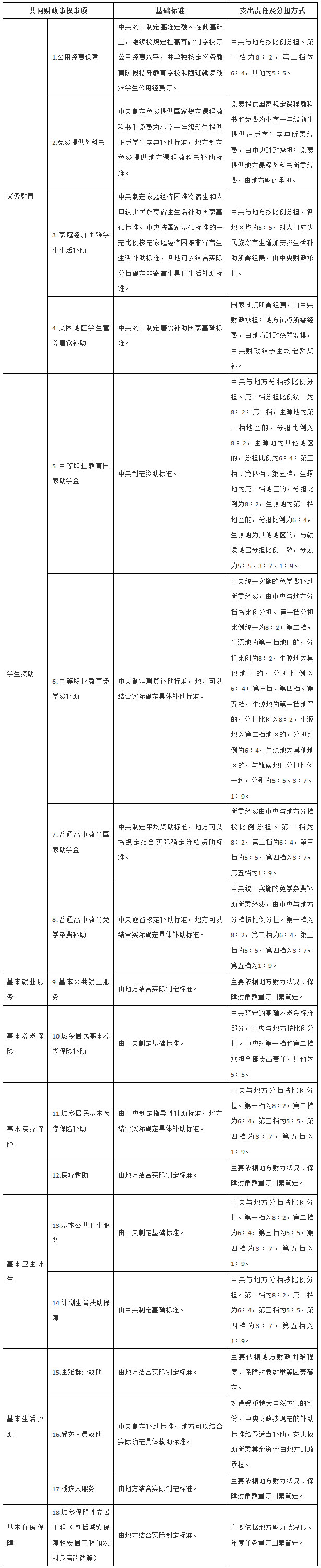 根据《国务院关于推进中央与地方财政事权和支出责任划分改革的指导意见》(国发〔2016〕49号),结合《国务院关于印发“十三五”推进基本公共服务均等化规划的通知》(国发〔2017〕9号),将涉及人民群众基本生活和发展需要、现有管理体制和政策比较清晰、由中央与地方共同承担支出责任、以人员或家庭为补助对象或分配依据、需要优先和重点保障的主要基本公共服务事项,首先纳入中央与地方共同财政事权范围,目前暂定为八大类18项:一是义务教育,包括公用经费保障、免费提供教科书、家庭经济困难学生生活补助、贫困地区学生营养膳食补助4项;二是学生资助,包括中等职业教育国家助学金、中等职业教育免学费补助、普通高中教育国家助学金、普通高中教育免学杂费补助4项;三是基本就业服务,包括基本公共就业服务1项;四是基本养老保险,包括城乡居民基本养老保险补助1项;五是基本医疗保障,包括城乡居民基本医疗保险补助、医疗救助2项;六是基本卫生计生,包括基本公共卫生服务、计划生育扶助保障2项;七是基本生活救助,包括困难群众救助、受灾人员救助、残疾人服务3项;八是基本住房保障,包括城乡保障性安居工程1项。