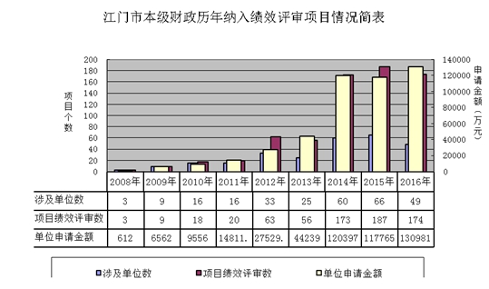 1、绩效目标评审把好资金的“过门关”。绩效目标管理是全过程预算绩效管理的基础,在整个预算绩效管理中处于龙头地位,也是近几年预算绩效改革的关键点和着力点。一是加强培训指导,做好部门预算单位培训指导基础工作。为使各项目单位绩效目标设定规范科学合理,自2012年开始,江门局每年召开预算绩效管理培训班,邀请专家学者对绩效目标设定进行详细的讲解;在2016年,进一步扩大培训范围,培训对象覆盖各市直单位、各市区财政局、第三方机构负责人和本市绩效评价专家;2017年拟将单位绩效自评复审也纳入常规培训范围。二是目标评审的范围和金额逐年扩大。江门局从2008年起逐年增大绩效目标评审范围,纳入评审范围从原来的试点项目到2014年100万以上项目到2016年50万以上(含50万)的所有项目全部纳入绩效评价管理范围,从2008年的3个项目到2016年的174个项目,涉及财政资金从2008年的612万到2016年13.09亿元,江门市本级预算绩效目标评审范围和金额呈跨越式发展(如下图)。