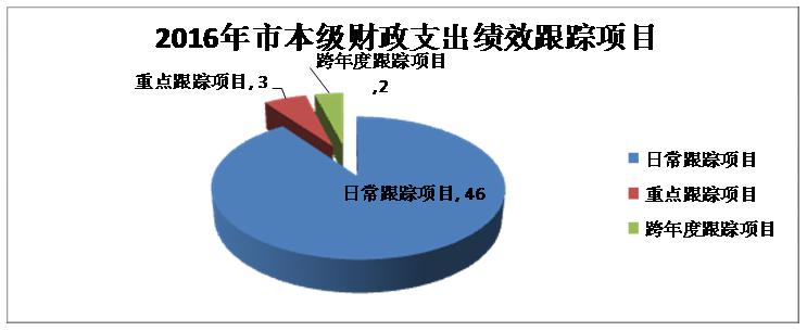 2、绩效跟踪评价把好资金的“进度关”。绩效跟踪评价是对财政专项资金按照一定时限开展绩效评价工作,反映资金该时段的资金使用效益,是促进财政专项资金进度达标和绩效目标完成的重要手段。跟踪评价的基本内容包括:项目资金支出进度、项目完成进度、项目执行基本情况、项目绩效目标实施情况等。该项工作自2015年开展试点,2016年全面开展,按照项目类别分为三大类:日常跟踪项目(2016年“1-9月份100万元以上进度小于50%”的项目)、重点跟踪项目(由市领导或局领导、支出科室提出本年度需要纳入跟踪的重大项目)、跨年度跟踪项目(对少数项目近两年绩效使用情况开展跟踪评价),2016年绩效跟踪对46个常规项目、3个重点项目、2个跨年度跟踪项目开展绩效跟踪工作(如下图)。