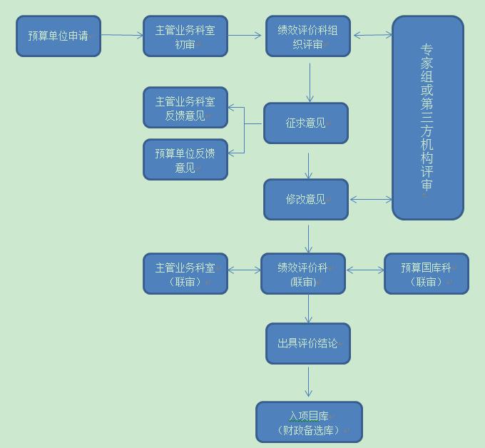 第五,建立规范的绩效评审流程。东莞市在推进预算绩效评审过程中坚持多方参与、协调联动,既要发挥财政部门内部科室工作职能,也积极借助行业专家和第三方机构力量,各司其职,环环相扣,节省时间,提高效率,避免重复审核。具体工作流程如下: