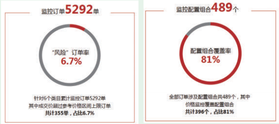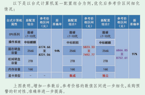 有效成交数据样本量越大,作为监测预警的标尺——生成的参考价越具说服力。为克服国采中心电子卖场成交数据样本不足、代表性不强的困难,在京东企业业务“京东中采云”技术和数据服务平台的支持下,我们把京东政企客户的成交数据纳入模型计算,按各品目关键参数及参数值进行排列组合,生成不同的配置集合,计算不同配置集合的参考价,作为采购预警的依据。目前,电子卖场6个品目的监测订单达5292笔,生成的配置集合从原来的51个扩展到现在的489个,参考价格的数值区间更加集中、合理。