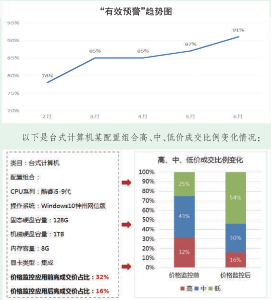 直购模式下,部分采购人对供应商报价缺乏敏感性,成为困扰内控和监管的难题。对采购人直购模式下,超过配置组合参考价格区间上限上浮10%的产品,国采中心会进行实时弹窗提醒,并在后台记录采购人下单的相关信息。从预警结果看,“有效预警”的比例不断提高,试运行期间,监测系统累计向采购人发出预警2712条,其中87%的采购人在系统提醒后,接受了预警建议,改选了符合参考价区间的报价完成采购,成交价逐步趋向合理。