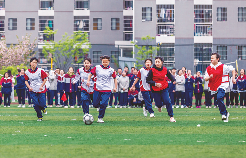 2022年积极的财政政策突出保基本兜底线,切实保障和改善民生。其中,包括支持建设高质量教育体系,优化教育支出结构,增加义务教育经费投入,促进义务教育优质均衡发展和城乡教育一体化。图为2022年3月29日,学生在贵州省黔西一中参加足球比赛。 人民图片 范晖/摄