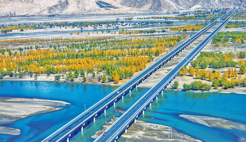 党的十八大以来,我国连续十年实施积极的财政政策,加大对基础设施建设投入力度。图为跨越雅鲁藏布江的拉贡机场高速路。 财政部供图 刘永恒/摄